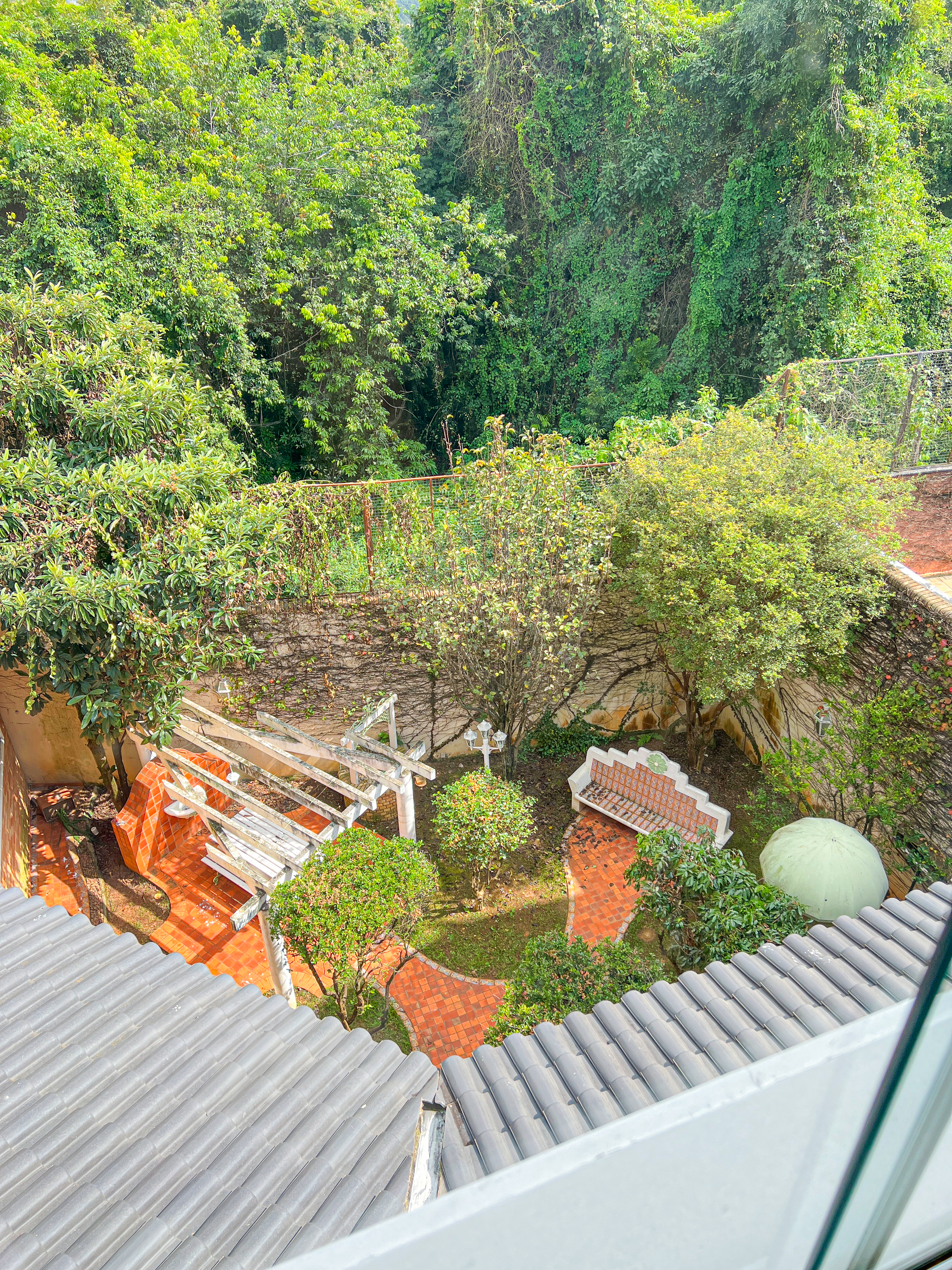 a)- No nível da rua lateral está localizado o pavimento que chamaremos de sub solo onde se encontra a garagem para 4 carros, casa das máquinas, uma caixa dágua de 10 mil litros abastecida tanto pelo SAAE como por um poço artesiano, um quarto da maquina de aspiração central, um conjunto de quarto sala e banheiro, casa dos botijões e um cômodo para guarda de materiais. Localiza-se também neste piso um jardim e um pomar com diversos tipos de arvores frutíferas. Este pavimento liga-se com o de cima por escada interna saindo da garagem e escada lateral de serviço.