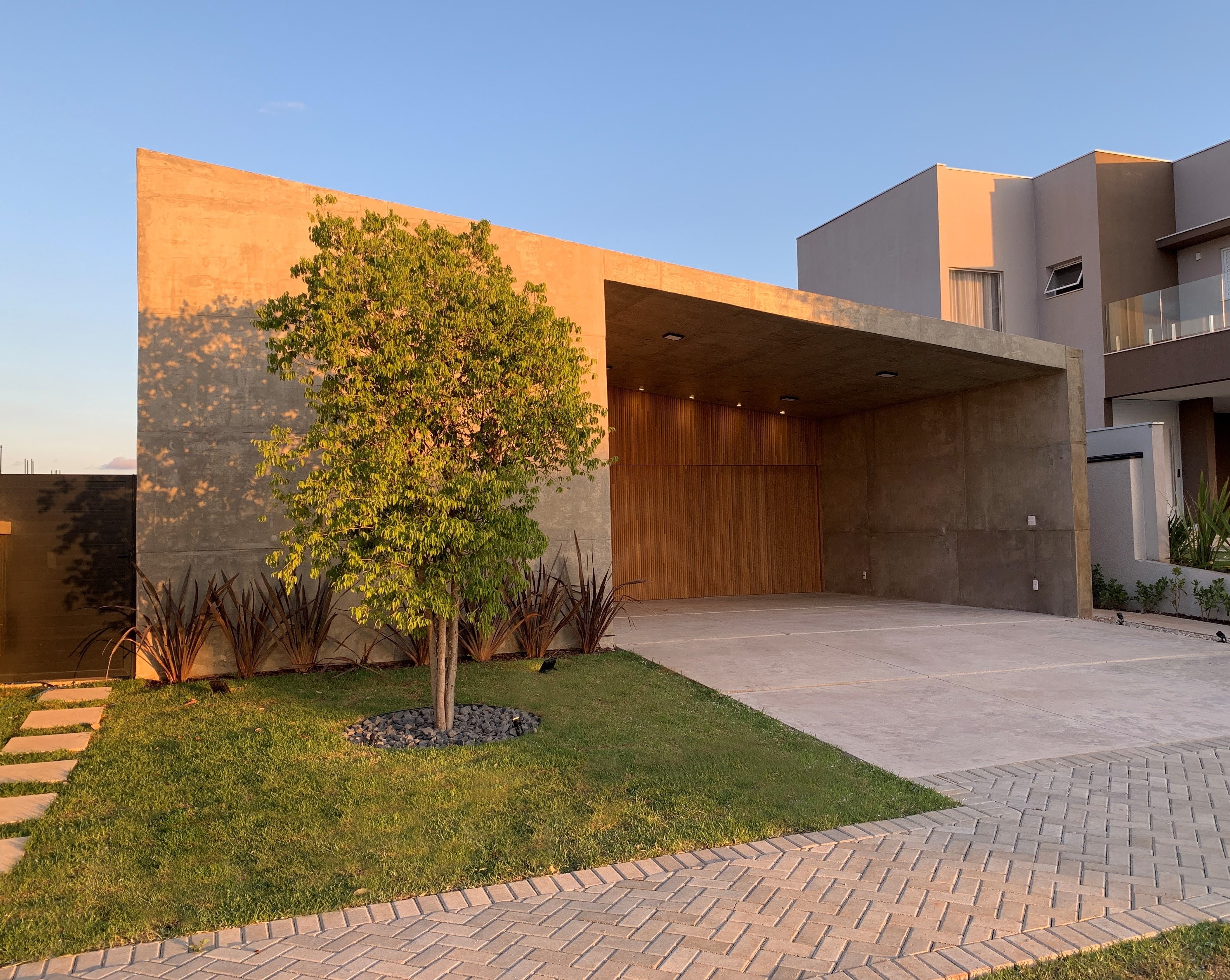 Além das especificidades arquitetônicas, todo o acabamento é dividido entre o cinza do concreto queimado com o marrom dos acabamentos em madeira acompanhando as linhas retas da arquitetura.